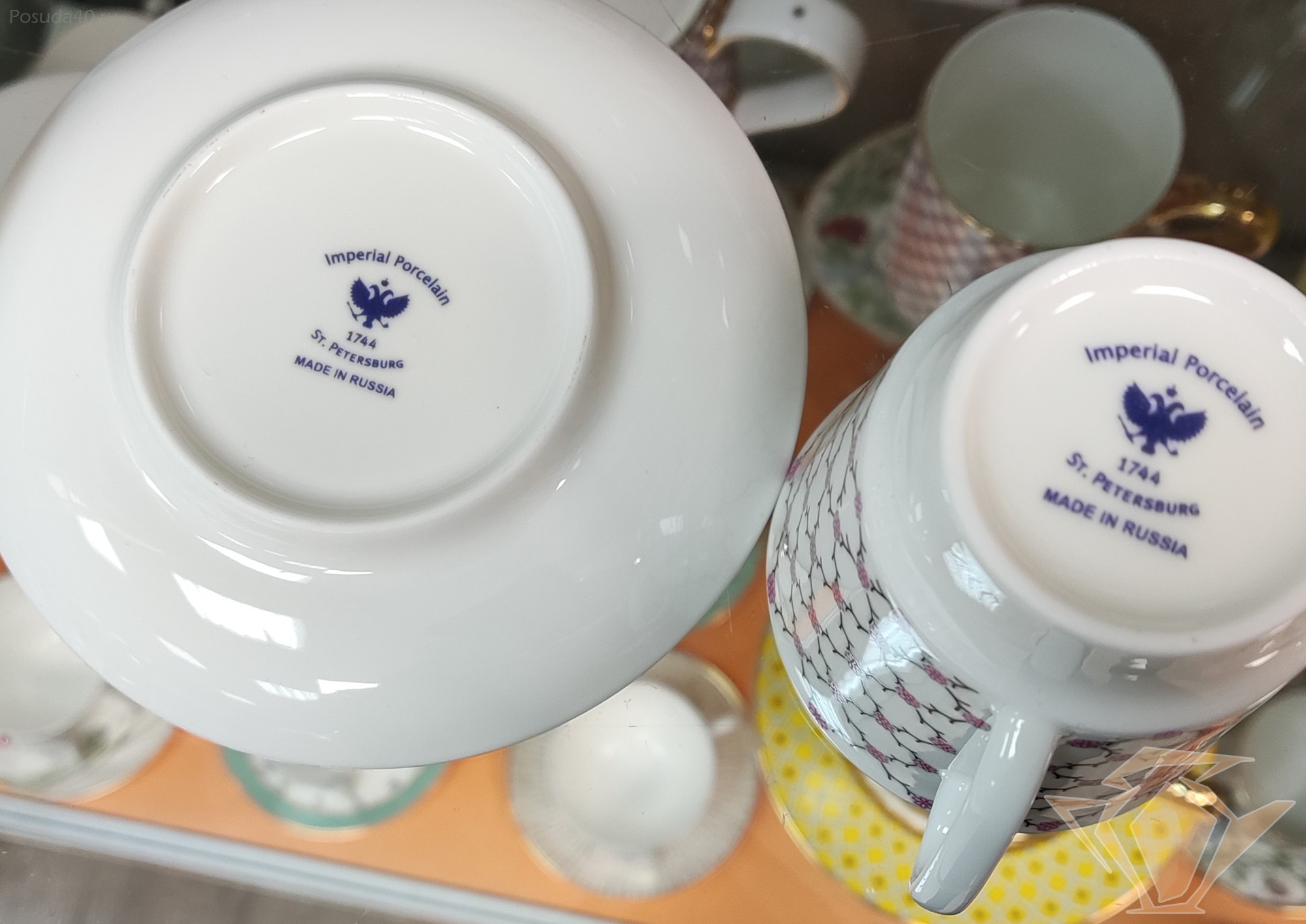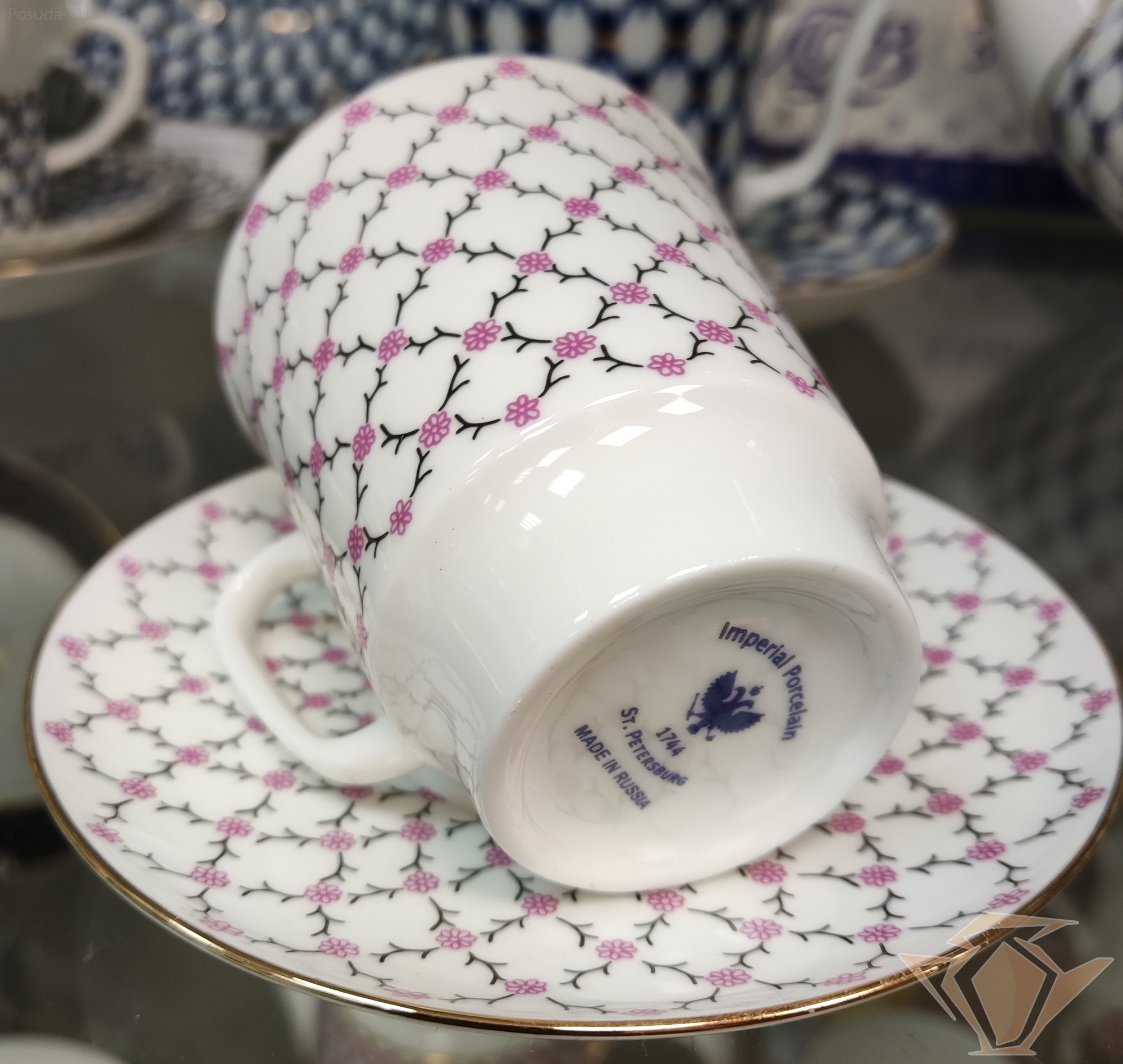 Кофейная пара Императорский фарфоровый завод, рисунок Розовая сетка