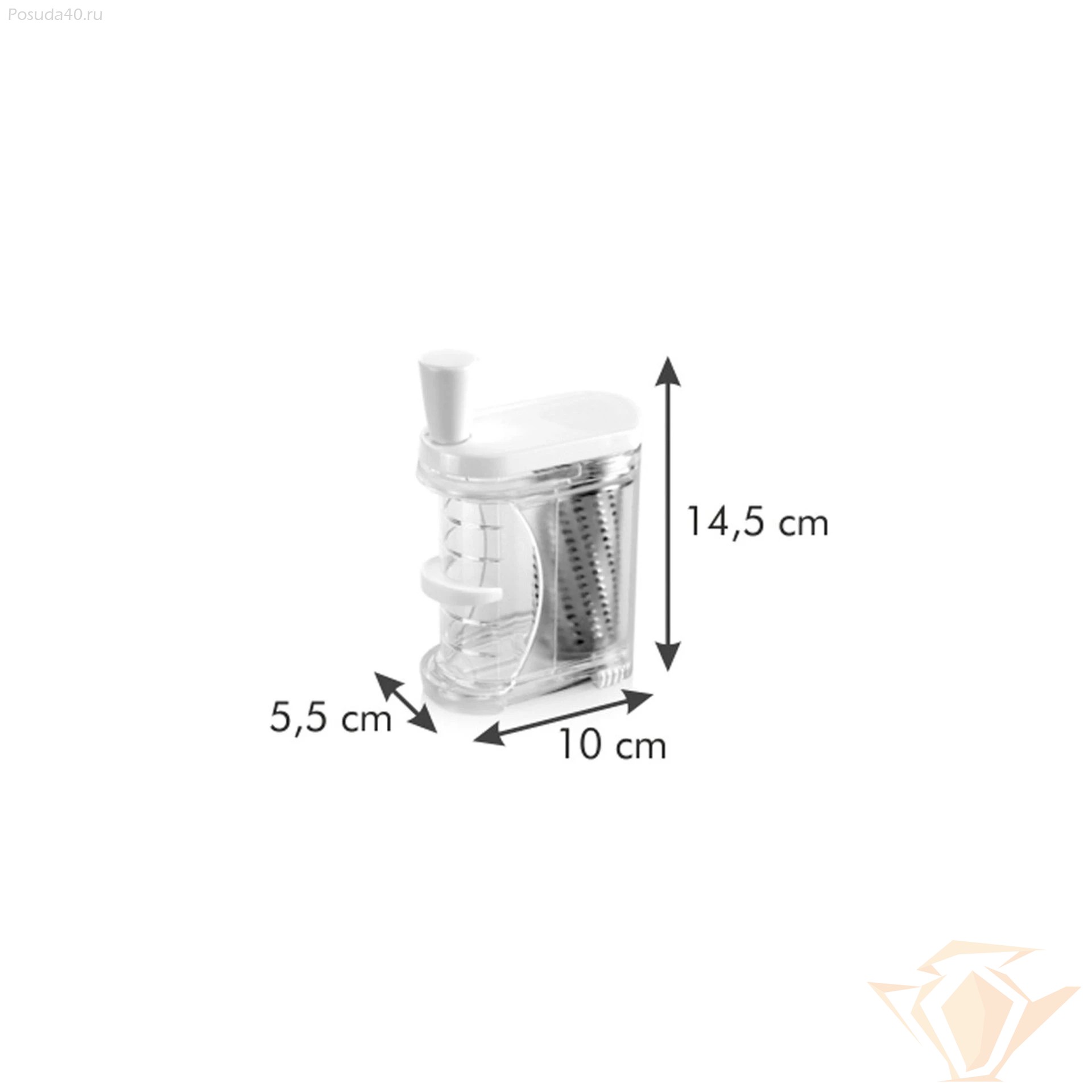 Тёрка для пармезана Tescoma Handy имеет компактные размеры (длина - 10 см, ширина - 5,5 см, высота - 14,5 см) и лёгкий вес, что делает ее удобной для хранения и использования.
