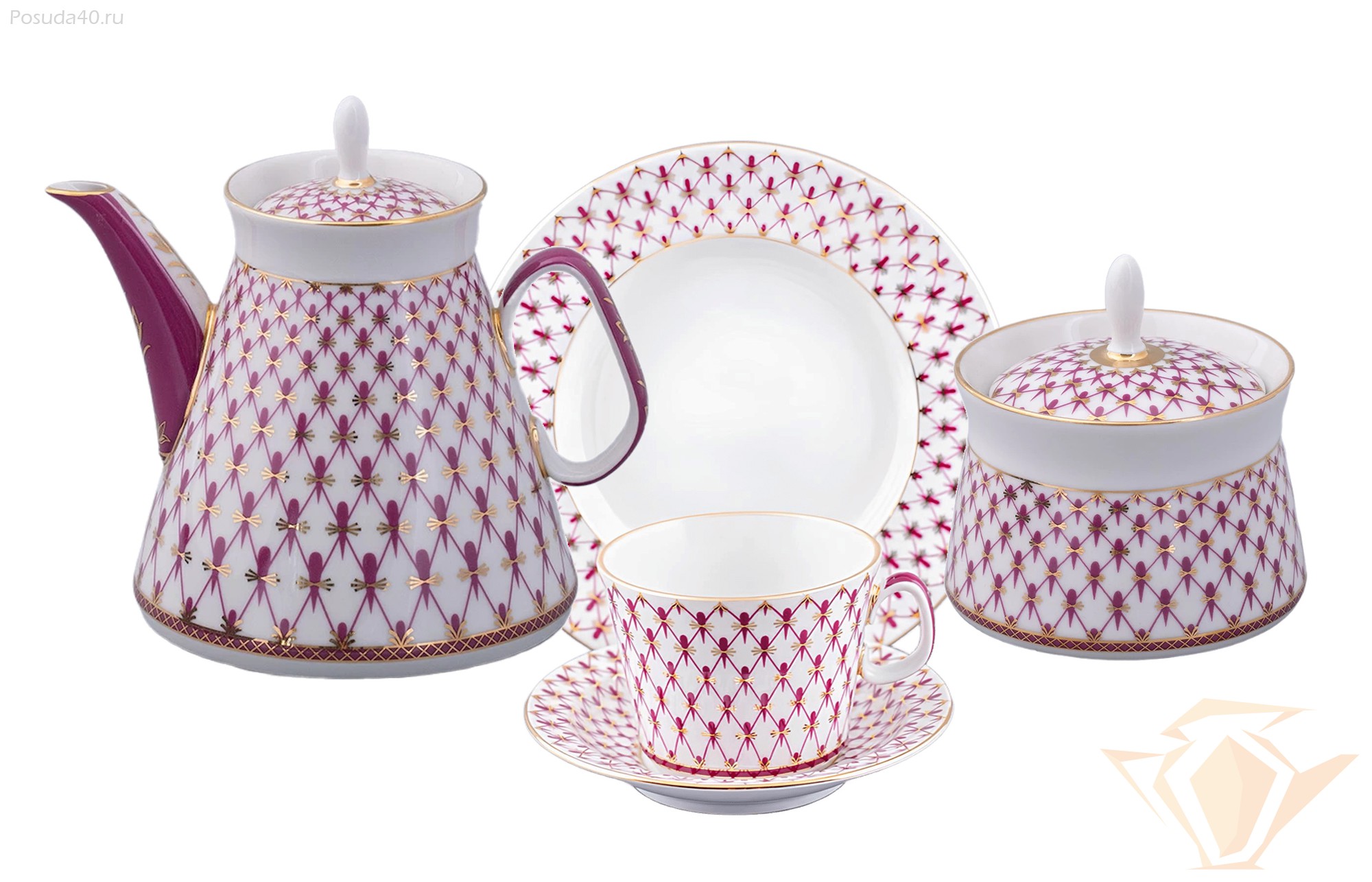 - Комплектация: 6 блюдец, 6 десертных тарелок, 6 чашек, сахарница, чайник