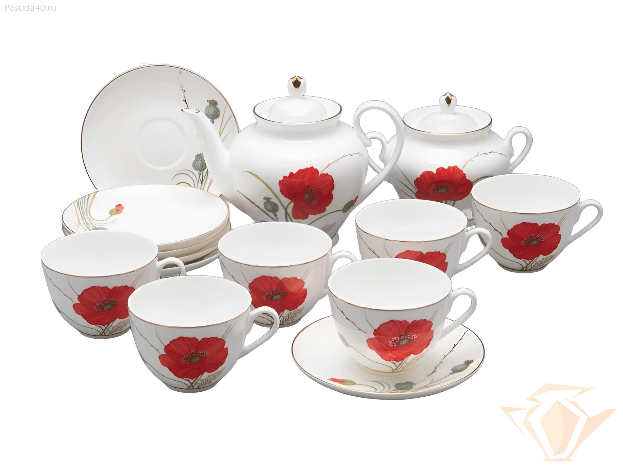 Сервиз чайный ИФЗ Весенняя-2, Маки, 14 предметов, 6 персон, костяной фарфор