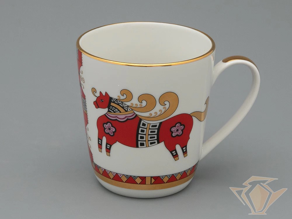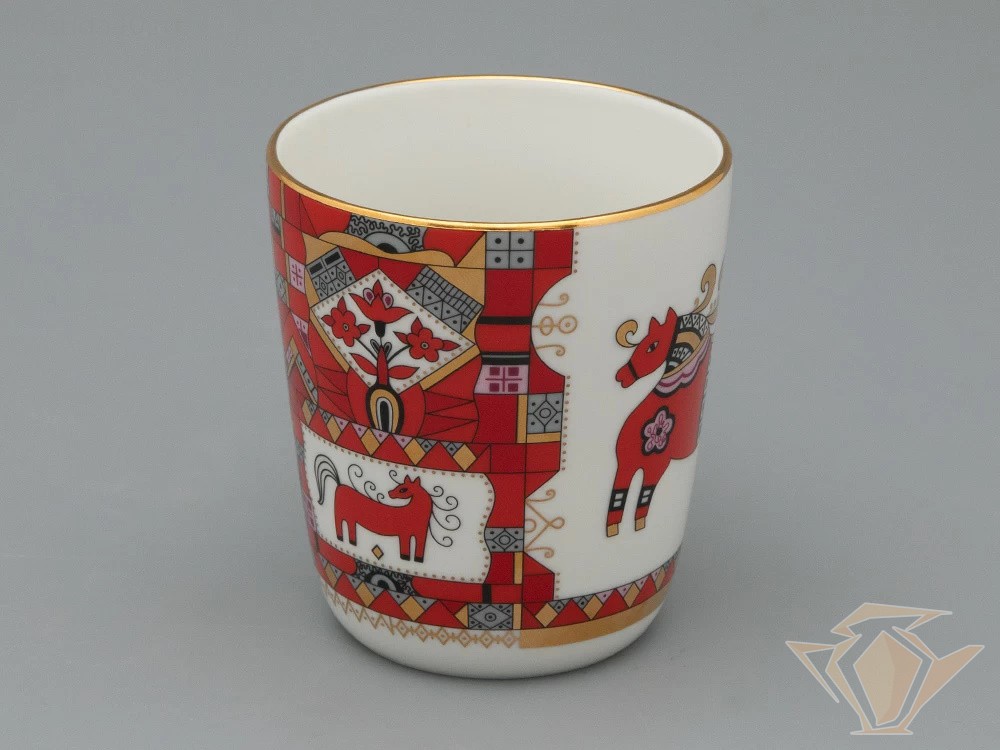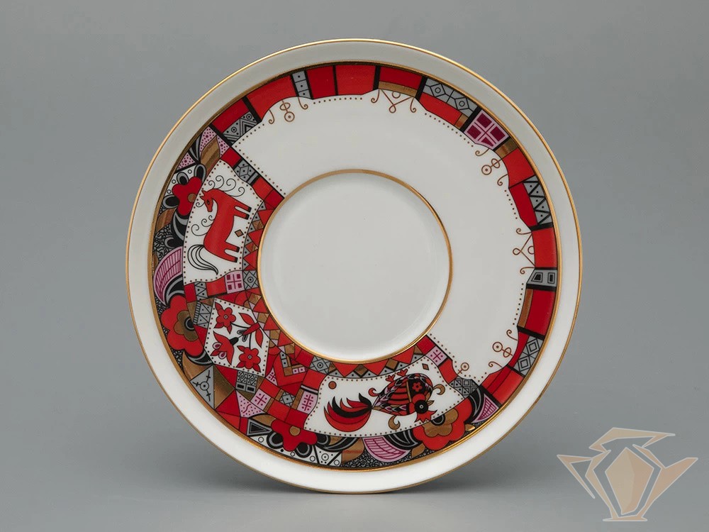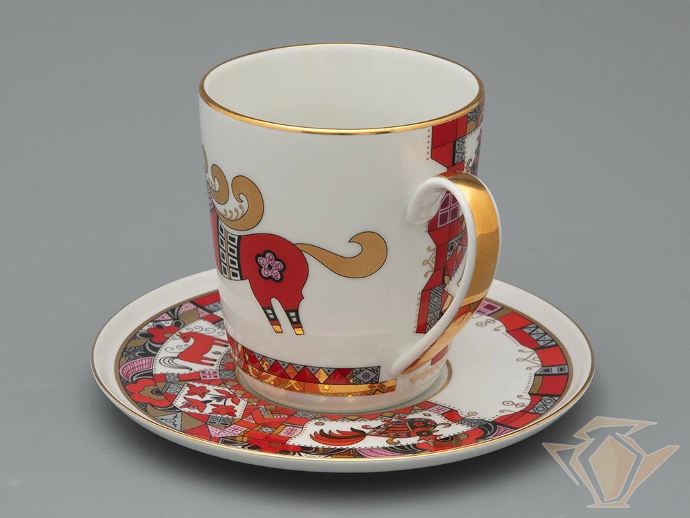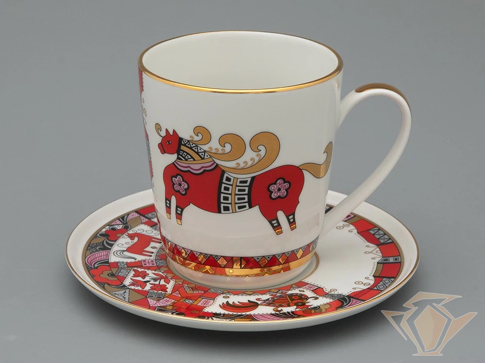 Чайная пара «Красный конь» на форме «Колокол» – это прекрасный функциональный аксессуар, который идеально впишется в интерьер кухни или столовой, наполнив пространство атмосферой настоящей русской сказки. Художественное оформление чайной пары выполнено по рисункам выдающегося художника Алексея Воробьевского (1906-1992), творчество которого – это чудесные фантазии, сказочные пейзажи и волшебство. Также художник обращался к нарядным мотивам русского народного искусства, переосмысливал элементы древнерусского орнамента. В результате Алексей Воробьевский разработал собственный самобытный «русский» стиль с яркой цветовой палитрой и точной прорисовкой деталей, что прекрасно демонстрирует рисунок «Красный конь». Чайная пара «Красный конь» станет прекрасным подарком для всех, кто хочет подчеркнуть свою любовь к русским традициям и внести нотку праздничности в интерьер.
