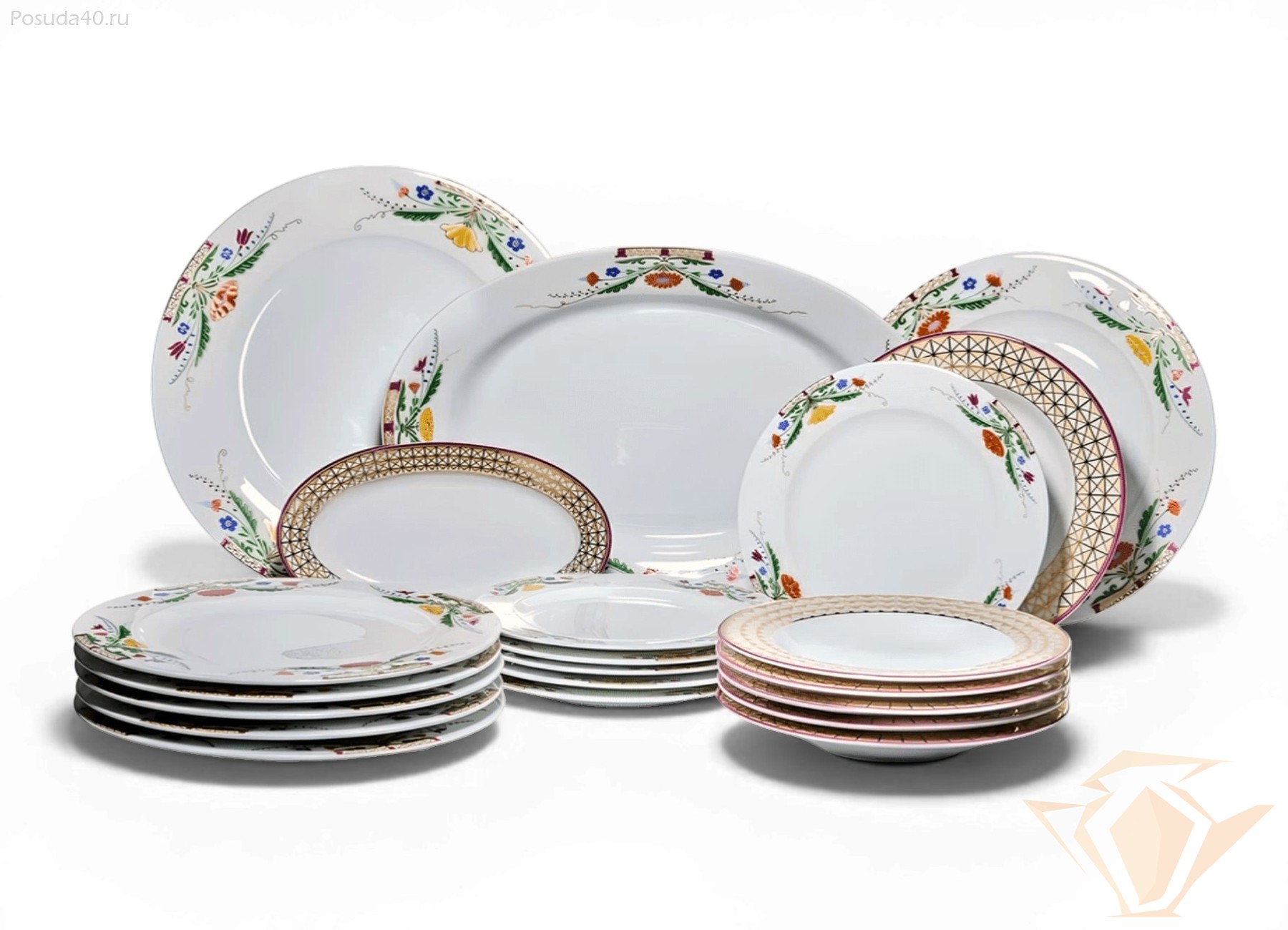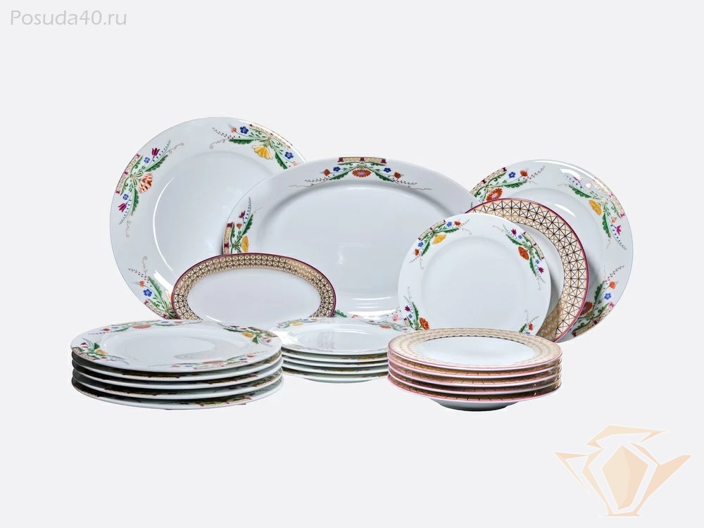 - Комплектация: 6 обеденных тарелок, 6 десертных тарелок, 6 суповых тарелок, блюдо большое, блюдо малое