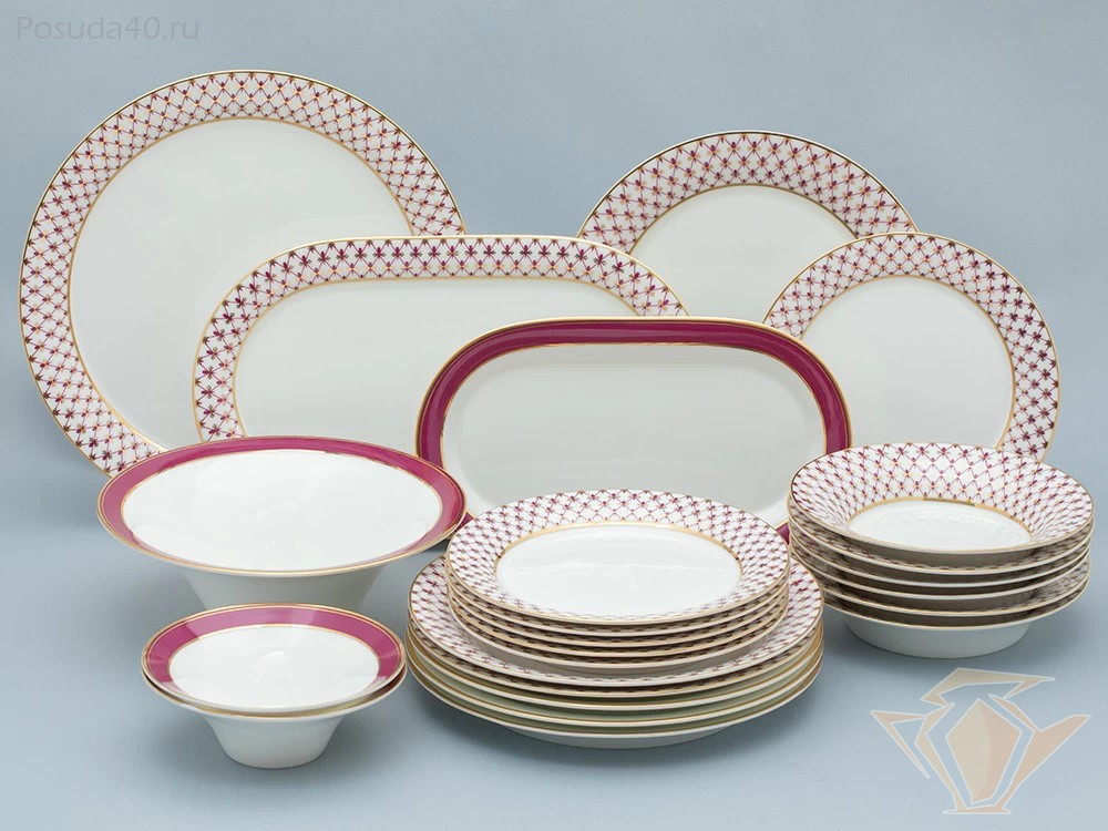 - Комплектация: 6 обеденных тарелок, 6 десертных тарелок, 6 суповых тарелок, блюдо большое, блюдо малое, салатник малый, салатник большой